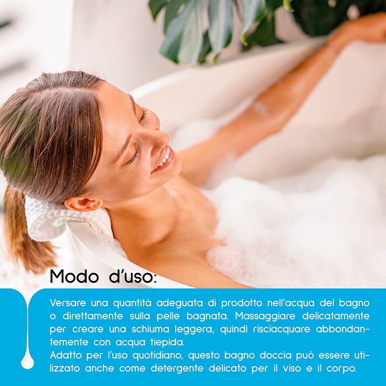 Versare una quantità adeguata di prodotto nell'acqua del bagno o direttamente sulla pelle bagnata. Massaggiare delicatamente per creare una schiuma leggera, quindi risciacquare abbondantemente con acqua tiepida. Adatto per l'uso quotidiano, questo bagno doccia può essere utilizzato anche come detergente delicato per il viso e il corpo.