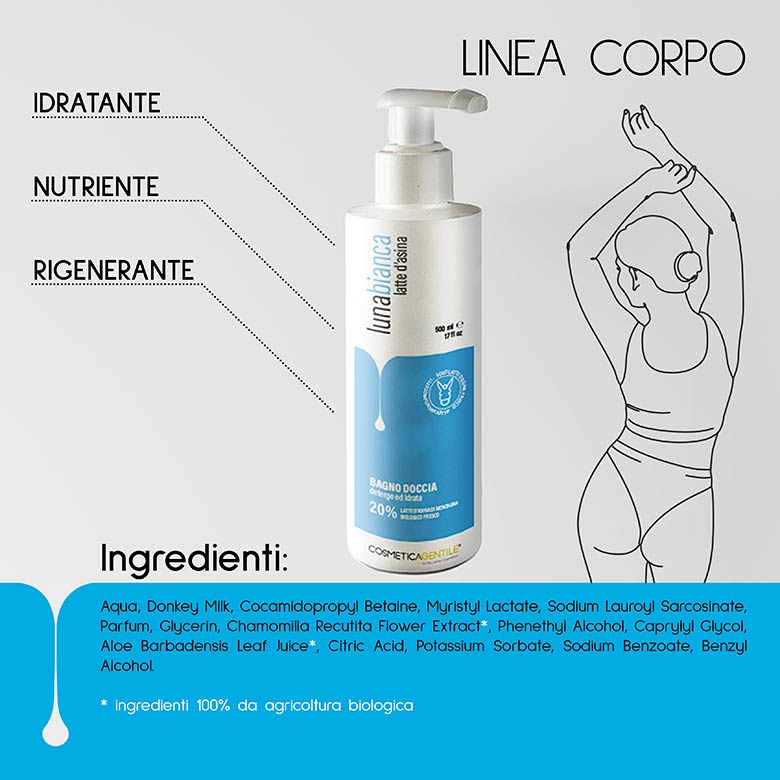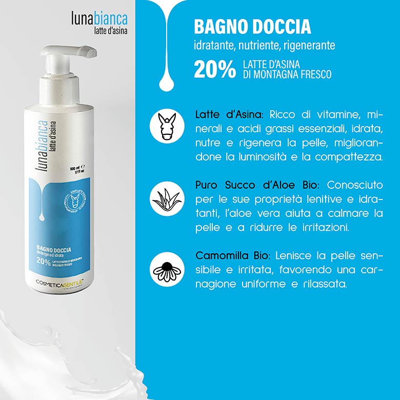 A differenza di molti brand che impiegano latte d’asina in percentuali minime a scopo puramente marketing, lunabianca Latte d’Asina di Cosmetica Gentile utilizza la concentrazione più alta e ottimale di latte d’asina, definita in 10 anni di ricerca, per esaltare al massimo le sue proprietà sulla pelle.