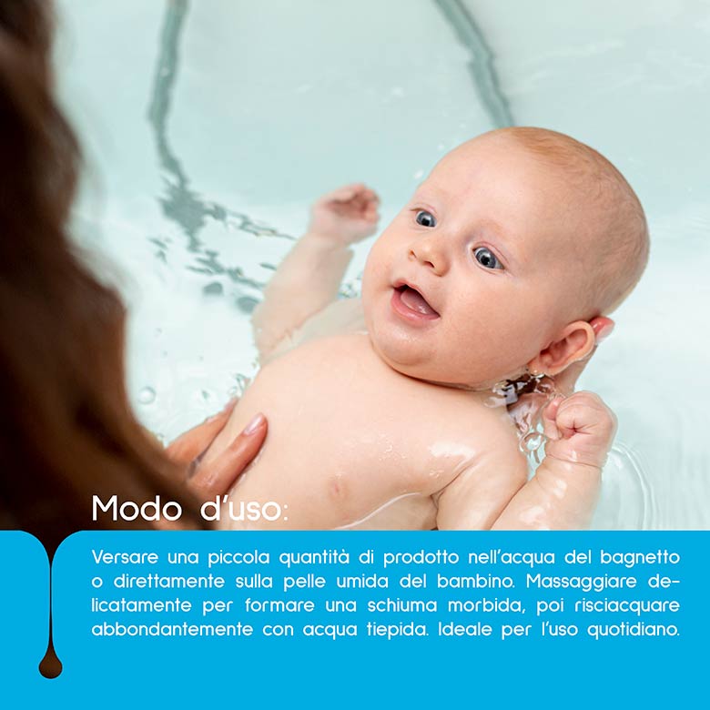 Versare una piccola quantità di prodotto nell'acqua del bagnetto o direttamente sulla pelle umida del bambino. Massaggiare delicatamente per formare una schiuma morbida, poi risciacquare abbondantemente con acqua tiepida. Ideale per l'uso quotidiano.